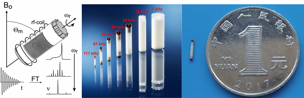 固体核磁的魔角旋转转子示意图(左)。用于不同转速的魔角旋转的固体核磁转子(中)。其中最小的0.7mm转子,可以达到111kHz(右)。