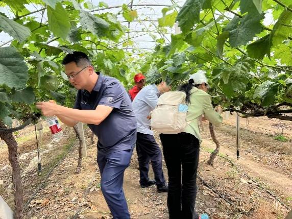 在基地考察环节,农场负责人系统介绍了农场的规模布局和果树品类,针对果树种植问题,进行了耐心细致的解答。抵达葡萄示范棚后,千坤、臧建业、张隆华亲自参与劳动实践,在农场负责人的示范与指导下完成葡萄剪枝疏果等操作,用行动诠释“五育融合”的理念。参观期间,校地双方还围绕如何更有效地将劳动实践与教育理念深度融合,以及怎样吸引学生更积极广泛地参与到劳育实践中展开热烈交流。现场氛围融洽,大家各抒己见、畅所欲言。