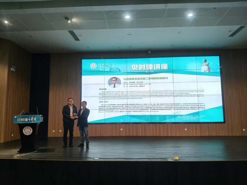 马欢教授长期致力于突触与神经可塑性、学习与记忆的神经基础研究。他指出,随着年龄增长,大脑中的能量和质量动态协调对于理解认知功能及其演变至关重要。本次讲座带来主题为“认知衰老与性别二态性的机制探讨”的学术报告,马欢教授首先探讨了神经活动与线粒体功能之间的复杂相互作用,特别是在大脑衰老过程中的线粒体基因转录调控的动态演变过程。在讲座的第二部分,马欢教授分享了课题组最新的研究进展:衰老过程中伴随的认知功能下降在男、女性别中的差异及可能的生理机制。报告指出,中年期小鼠在外周(肾脏)和中枢系统高度活跃的microRNA→γ-CaMKII通路是雌性小鼠中年期认知功能下降的主要原因之一,通过基因工程及药理学手段干预该通路调控的神经元活性,能有效延缓或改善认知功能的下降。这些发现为对抗年龄相关的认知衰退提供了新的思路,为未来的大脑衰老和神经退行性疾病研究开辟了有价值的途径。
