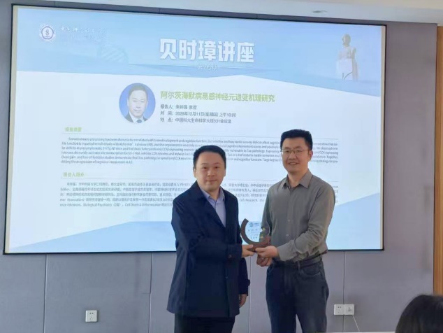 朱铃强教授作题为“阿尔茨海默病易感神经元退变机理研究”的学术报告。报告聚焦触觉加工与认知功能退变的关系,系统阐述了阿尔茨海默病(AD)患者触觉功能受损的临床证据及其与认知量表和病理指标的相关性。团队发现:AD个体的触觉功能下降与蒙特利尔认知评估评分呈显著负相关,与Tau病理负荷呈正相关;在症状前期3×Tg AD小鼠中亦可观察到类似触觉缺陷。进一步的机制研究显示,脊髓中表达胆囊收缩素(CCK)的神经元对Tau病理高度易感。在CCK神经元内表达突变体Tau-P301S会异常激活转录因子c-Maf,抑制CCK神经元活动并诱发触觉缺陷;相反,通过沉默Tau或c-Maf可恢复触觉感知,并改善AD模型小鼠的认知表现。基于增益与损失功能的系列证据,报告指出脊髓CCK神经元中的Tau病理是触觉功能障碍及认知功能受损的重要驱动因素,提示以触觉为靶点有望成为预测和干预认知减退进程的潜在策略。