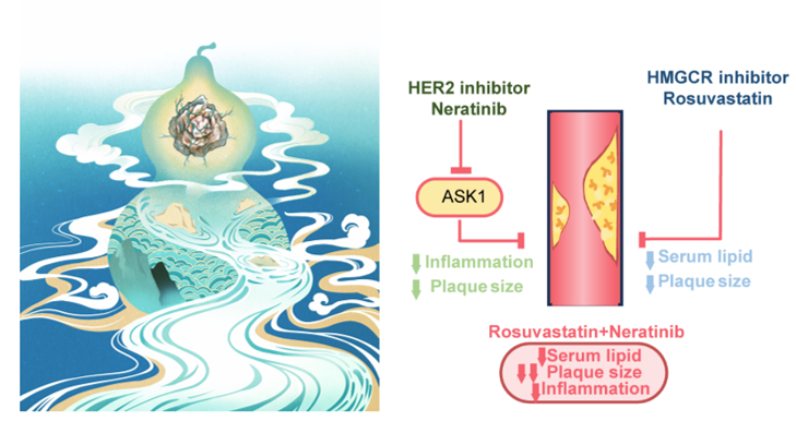 图. 联合使用来那替尼与瑞舒伐他汀达到降脂+抗炎双重效果。左图中葫芦象征本研究中的药物来那替尼。葫芦上半部嶙峋岩石与藤蔓缠绕,喻示着肿瘤及其蔓延的新生血管网络;下半部河流中砾石代表伴有动脉粥样硬化斑块的血管。来那替尼使浑浊河水由浊转清,逐渐清理河床礁石,终达治愈之效。