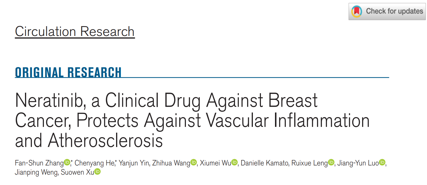 2026年1月9日,中国科学技术大学翁建平/徐索文团队联合浙江大学骆江云团队在心血管领域权威期刊Circulation Research在线发表题为“Neratinib, a Clinical Drug Against Breast Cancer, Protects Against Vascular Inflammation and Atherosclerosis”的研究论文。该研究利用CMap 数据库,首次发现抗乳腺癌药物来那替尼(Neratinib)具有显著的抗血管炎症和抗动脉粥样硬化作用。