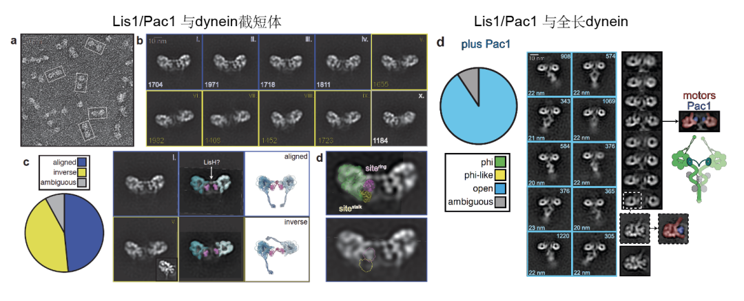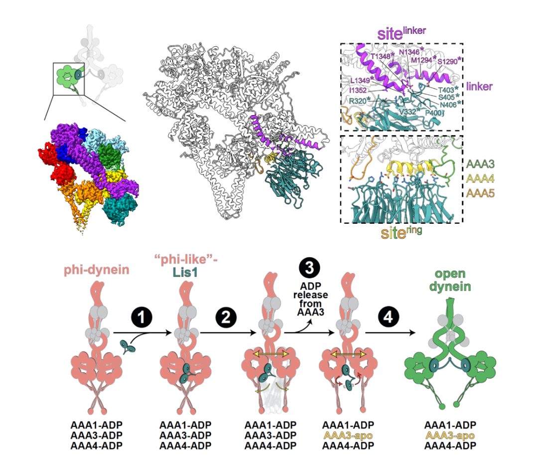 Dynein是一种沿微管运输多种细胞物质的重要分子马达,参与组织形态发生、有丝分裂等关键细胞过程。为了确保其在正确的时空环境中被激活,dynein的活性受到严格调控。其中,自抑制构象(因形似希腊字母Φ而被称为Phi构象)是其调控的关键中间态。光滑脑回(lissencephaly)相关蛋白Lis1被认为是解除dynein自抑制的重要激活因子。尽管已有大量细胞学、生化及结构研究表明Lis1可“打开”dynein的自抑制或稳定其开放(open)构象,但Lis1在全长dynein背景下发挥作用的精确分子机制仍不明确。