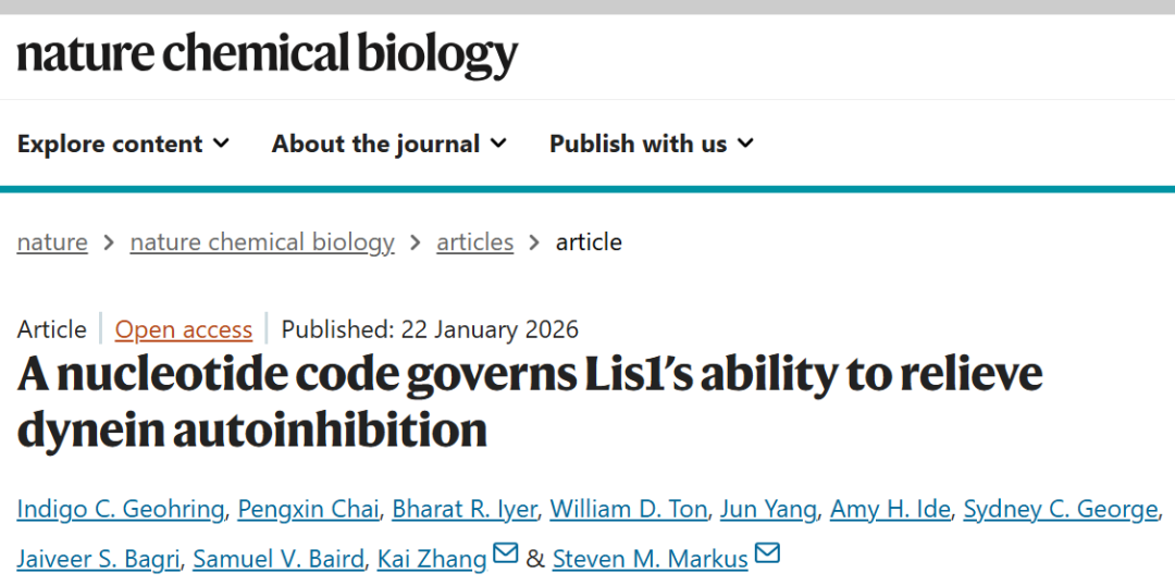 北京时间2026年1月22日18时,中国科学技术大学张凯课题组与科罗拉多州立大学Steven Markus课题组在《自然—化学生物学》(Nature Chemical Biology)发表合作研究成果,揭示了一种调控胞质动力蛋白-1(cytoplasmic dynein-1,简称dynein)活化的“核苷酸密码(nucleotide code)”,并发现了此前未被报道的关键中间态。