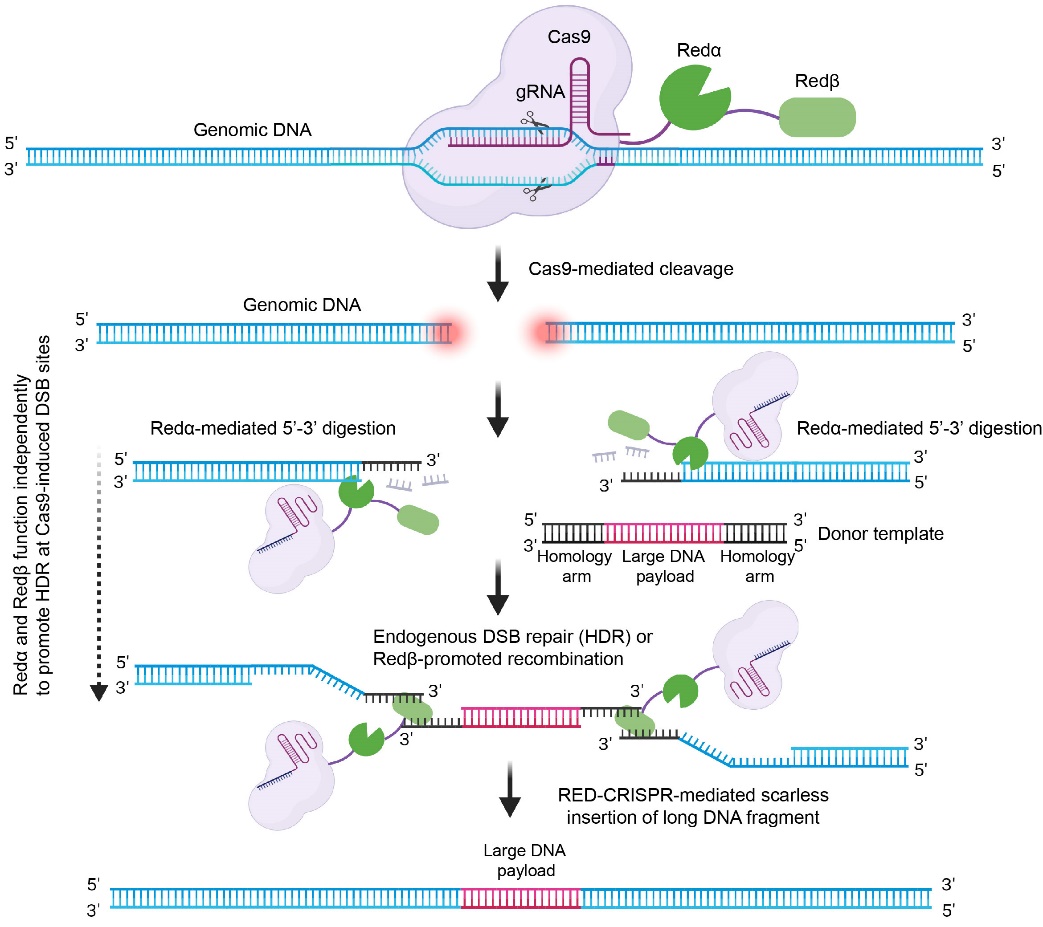 2025年12月10日,中国科学技术大学鲍坚强课题组、程临钊课题组,联合南京医科大学王成坤课题组以及山东大学刘洪彬课题组、张友明课题组在Nature Communications杂志发表了题为“Efficient high-precision transgene knock-in by Recombinases (Redα/β)-enhanced DNA integration-CRISPR-Cas9 (RED-CRISPR)”的研究论文,报道了一种基于Redα/β重组酶增强的高效精准大片段基因敲入RED-CRISPR系统,为解决上述瓶颈提供了创新方案。原文链接:https://doi.org/10.1038/s41467-025-67239-w