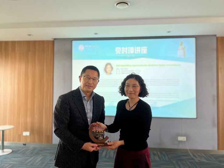 在报告开始前,校党委副书记周丛照教授为彭玲教授颁发了“贝时璋讲座”嘉宾纪念牌。