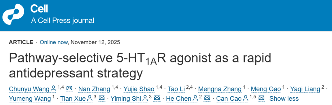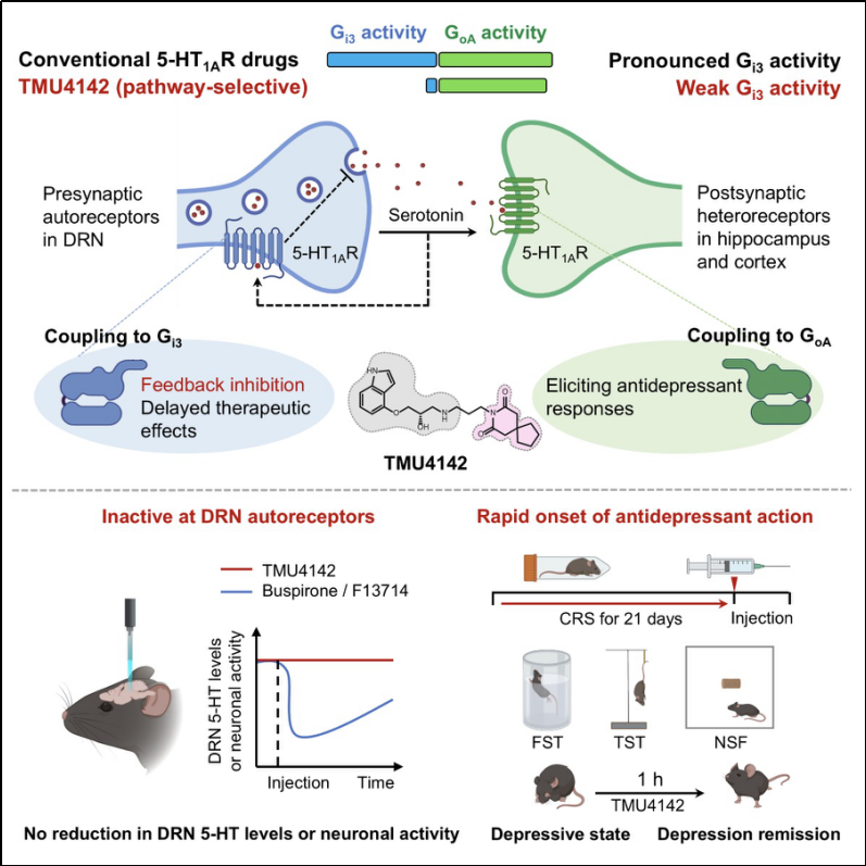 2025年11月12日,中国科学技术大学生命科学与医学部、免疫应答与免疫治疗全国重点实验室、合肥综合性国家科学中心大健康研究院曹灿教授课题组与中国科学技术大学生命科学与医学部薛天教授课题组以及天津医科大学陈贺特聘研究员课题组联合研究团队,在Cell杂志发表题为“Pathway-Selective 5-HT1AR Agonist as a Rapid Antidepressant Strategy”的研究文章。该研究提出了一种基于5-HT1A受体信号通路选择性的快速抗抑郁新策略,并据此理性设计出候选化合物TMU4142。实验结果显示,TMU4142在抑郁小鼠模型中展现出显著的快速抗抑郁样效果。该策略直击临床上选择性血清素再摄取抑制剂(SSRIs)类抗抑郁药物普遍存在的起效缓慢难题,为新一代快速抗抑郁药物的研发提供了崭新的思路和可行路径。