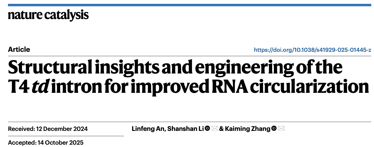 2025年11月18日,中国科学技术大学生命科学与医学部张凯铭/李珊珊课题组在Nature Catalysis杂志发表研究论文“Structural Insights and Engineering of T4 td Intron for Improved RNA Circularization”。本研究是课题组在核酶领域的又一重要研究突破(Nature 2021; PNAS 2022; Nucleic Acids Research 2023; Nature Communications 2023; Nature 2025)。