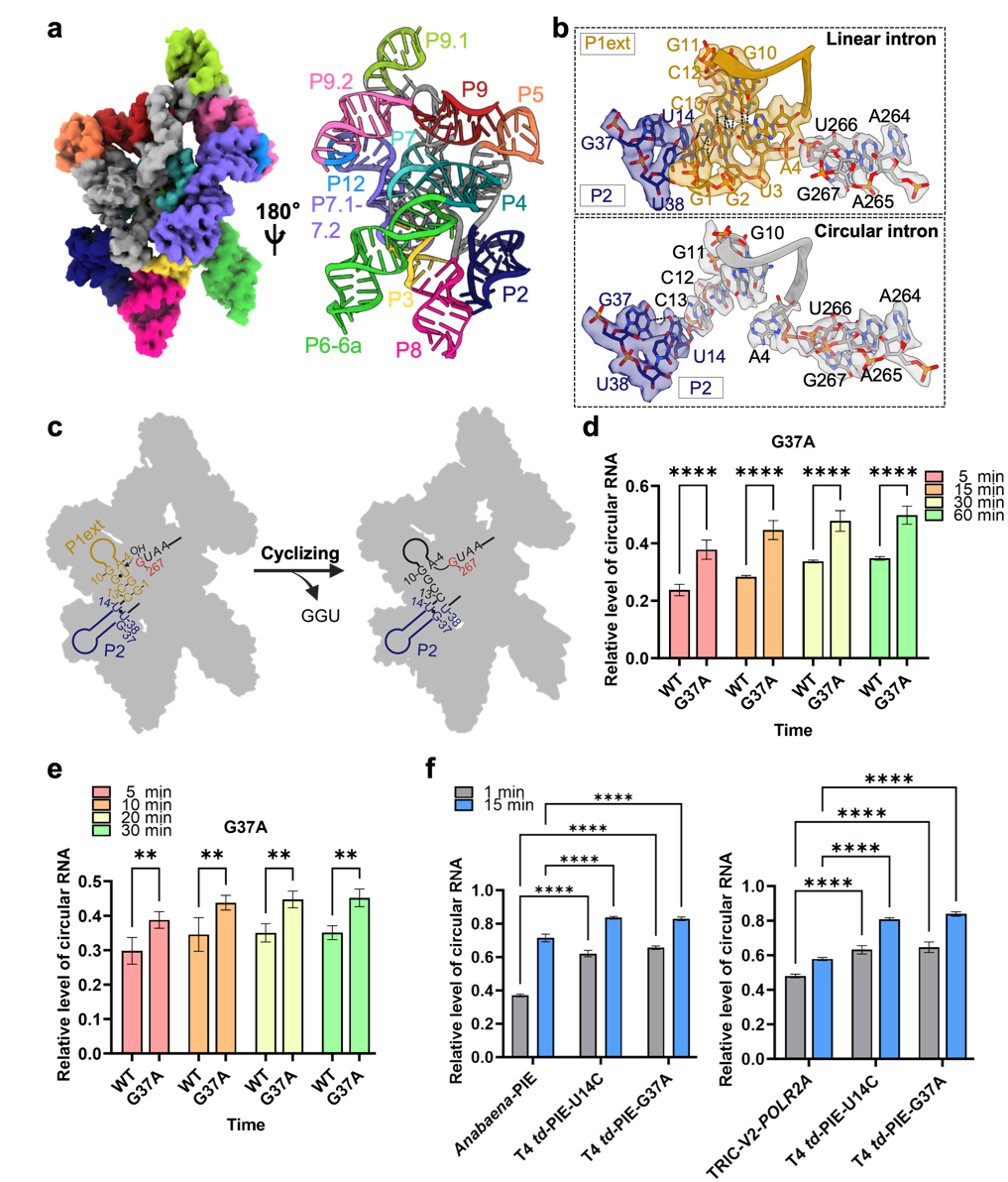 图注:a.环状 T4 td内含子的 3.3 Å 高分辨率冷冻电镜结构;b.线性与环状内含子中P1ext与P2区域的结构对比;c. T4 td内含子环化机制示意图;d. G37A突变显著提升 T4 td内含子的环化效率;e.在T4 td-PIE系统中,G37A 突变促进POLR2A circRNA的高效生成;f.结构指导下优化的T4 td-PIE突变体在环化效率上优于Anabaena-PIE 和 TRIC-V2 系统。