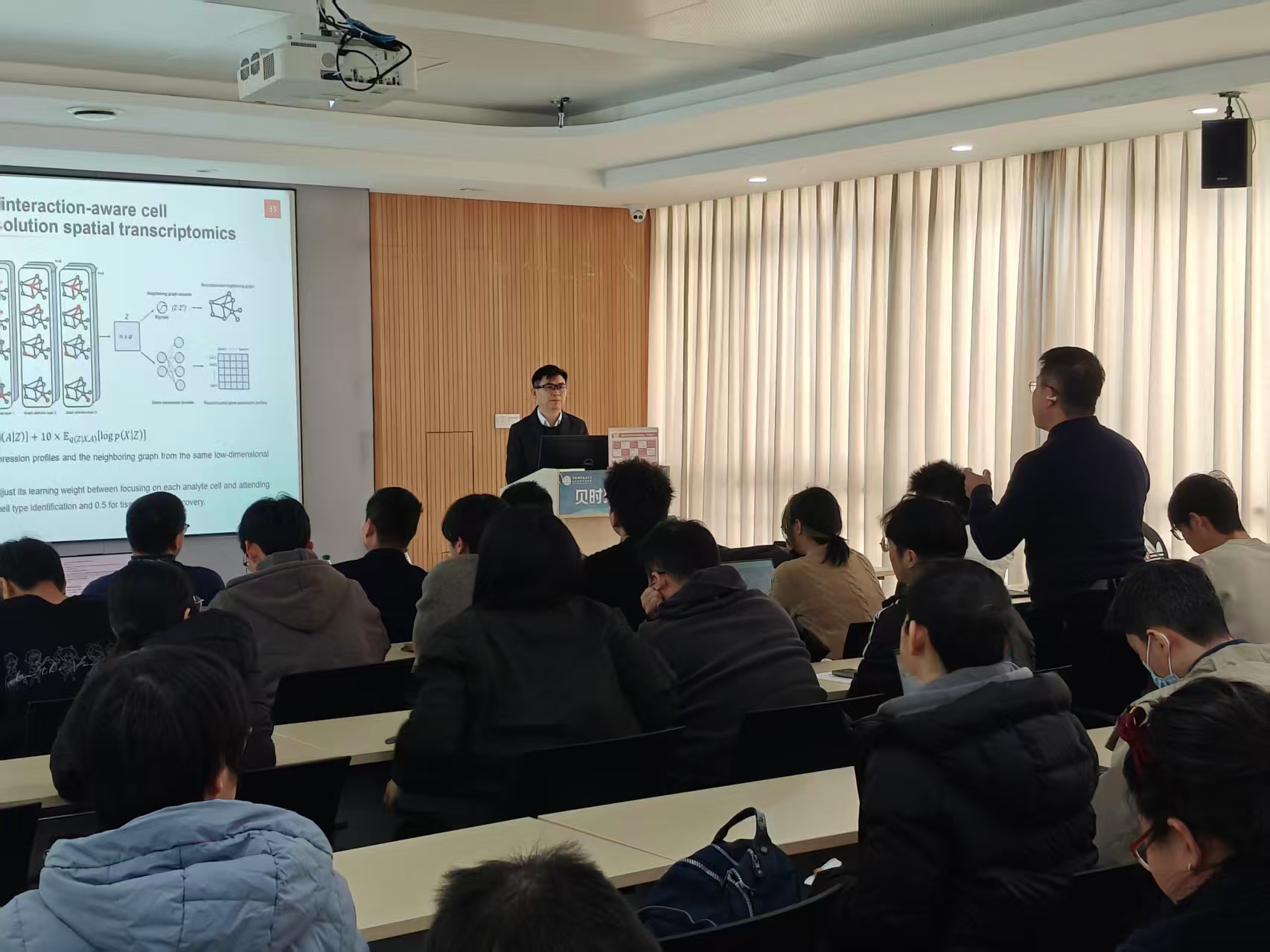 针对这一挑战,张强锋研究员团队创新性地构建了一套端到端的深度学习整合框架。他向在场师生详细阐释了该框架的技术核心:首先利用变分自编码器(VAE)对高维稀疏的单细胞转录组数据进行流形学习,提取深层潜在特征;进而引入图神经网络(GNN)融合空间位置编码,构建细胞间的空间邻域拓扑图。这种 “特征-拓扑”双流融合机制,成功实现了基因表达模式与物理空间结构在低维潜空间的精准对齐,从而能够高精度地注释细胞类型并自动化分割空间功能域。