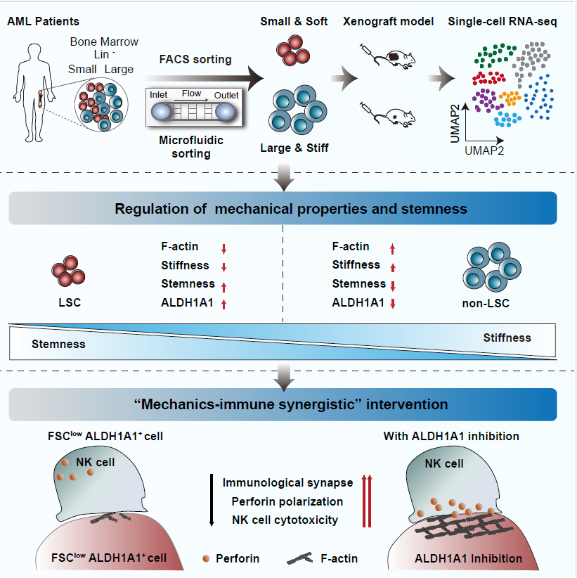 本研究独辟蹊径,从细胞力学生物学角度切入,发现那些具有最强干性、致病能力和耐药性的LSCs,普遍具有“小而软”的物理特征。团队利用自主研发的微流控芯片技术,成功实现了基于力学性质的“小而软”白血病的高纯度、无标记分选,为精准捕获LSCs提供了创新工具。随后,通过单细胞测序技术,团队在AML患者样本中精准鉴定出一个富含LSCs的关键亚群:FSClow ALDH1A1+细胞。这一亚群不仅干性特征显著,其细胞骨架蛋白F-actin的水平也更低,细胞皮层更软。深入研究揭示,ALDH1A1不仅是该亚群的标志物,更是一个调控细胞力学属性的关键开关。当使用ALDH1A1抑制剂或基因手段抑制ALDH1A1后,LSCs内的F-actin发生聚合,细胞随之“变硬”。这一力学性质的改变,直接导致LSCs自我更新和致白血病能力下降,对化疗药物更敏感。
