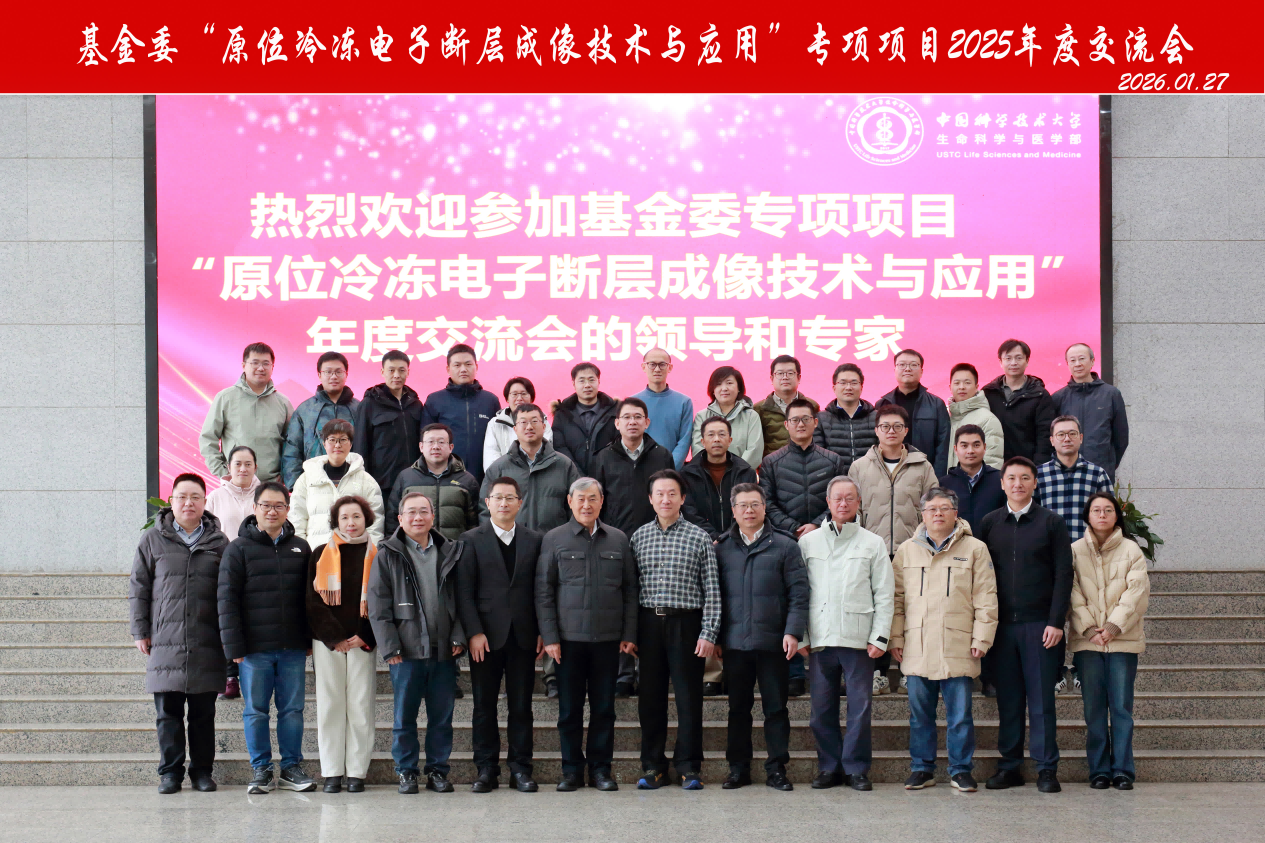 2026年1月27日,基金委专项项目“原位冷冻电子断层成像技术与应用”专项项目年度交流会在中国科学技术大学生命科学与医学部顺利召开。会议由中国科学技术大学主办,生命科学与医学部党委书记臧建业教授主持会议,中国科学技术大学校党委副书记周丛照教授和科研部孙方稳部长分别致开幕词,无膜细胞器与细胞动力学教育部重点实验室主任姚雪彪教授出席会议。专项项目组成员隋森芳、周丛照、何俊、何勇宁、李雪明、黄小俊、季刚、张法、王培毅、朱平、李赛等11位专家学者围绕冷冻电镜断层成像技术(Cryo-ET)分别做年度进展报告,数十位与会专家参与了深入讨论,对每个项目的工作进行了评价,并提出了多项建设性意见,为推动国内Cryo-ET技术发展与应用研究提供了新的思路和方向。