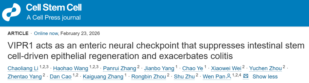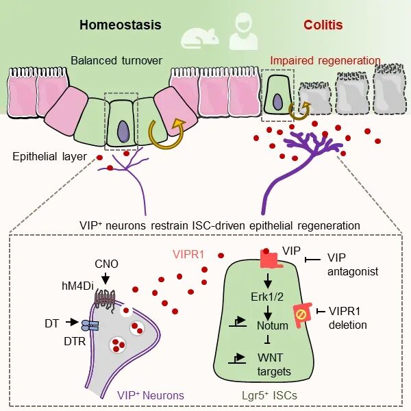 2026年2月23日,中国科学技术大学生命科学与医学部、免疫应答与免疫治疗全国重点实验室潘文教授团队在Cell Stem Cell发表论文“VIPR1 acts as an enteric neural checkpoint that suppresses intestinal stem cell-driven epithelial regeneration and exacerbates colitis”,首次提出调控肠道上皮修复再生的“神经检查点”机制。研究揭示,在炎症性肠病 (IBD) 等慢性炎症中,VIP能神经元通过直接激活干细胞受体VIPR1,抑制上皮再生程序,延缓黏膜愈合并加重炎症进展,确立了神经系统对肠道上皮修复的关键门控作用。