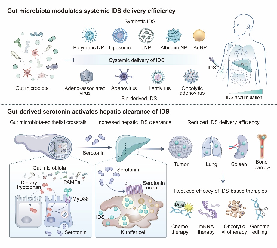 本研究揭示了由共生菌驱动的肠道-肝脏免疫轴是调控IDS清除和系统递送效率的关键机制,提供了直接证据表明,通过调节内源性生物通路可以突破药物递送领域长期存在的屏障。从转化医学角度看,靶向色氨酸代谢或血清素信号通路,为通过减少快速肝脏清除或降低肝毒性来提升IDS递送效果提供了一种具有广泛适用性的策略,对基因治疗、mRNA疗法及精准肿瘤治疗具有重要前景。