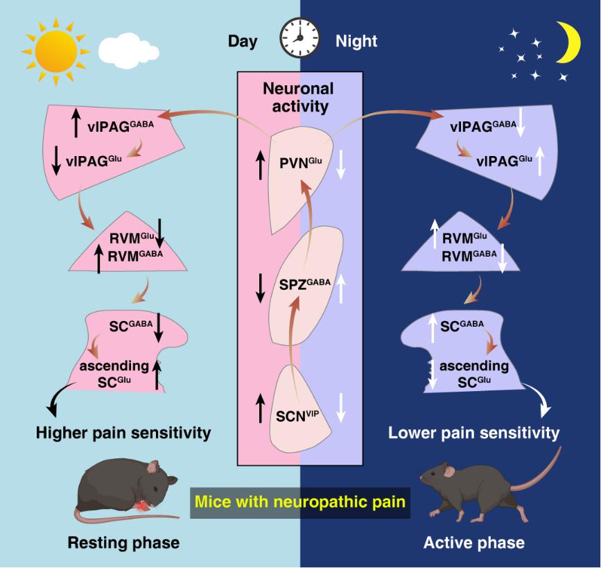 疼痛和痛觉感知存在昼夜节律性现象,例如,神经病理性疼痛和关节炎疼痛患者的症状通常在夜晚时加剧,机制尚不清楚。该问题的解析对于理解疼痛的病理学机制以及临床的疼痛管理具有重要意义。