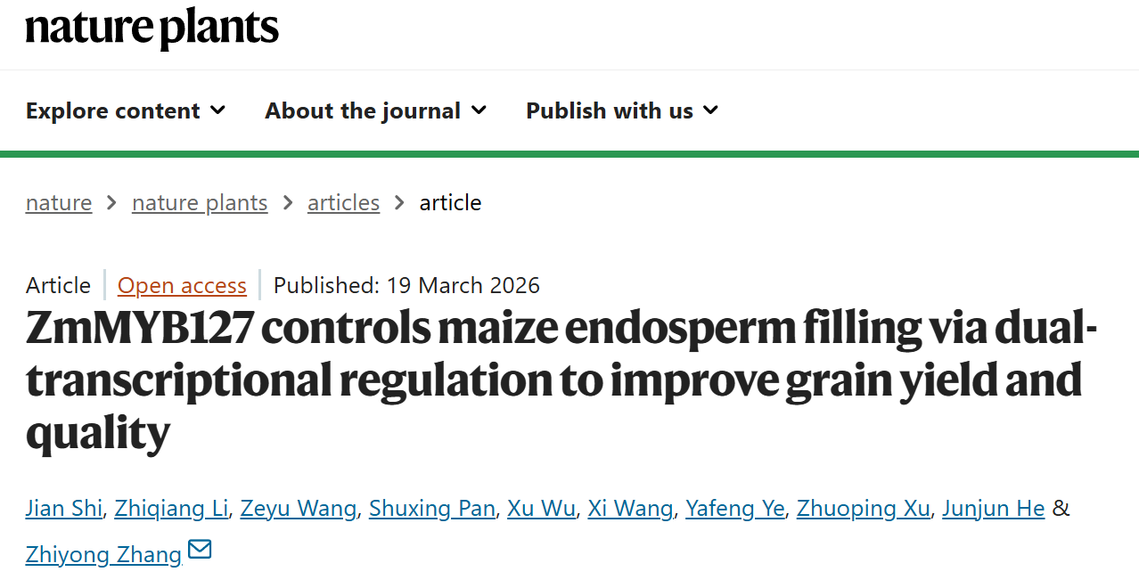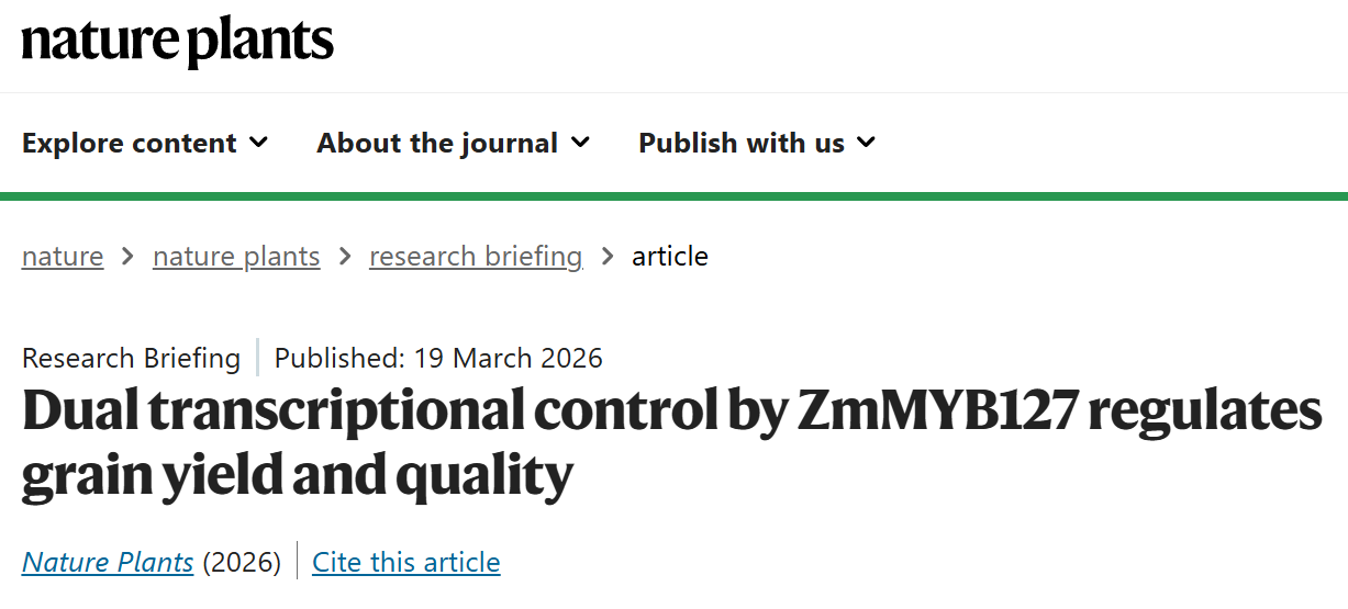 2026年3月19日,《Nature Plants》在线发表了中国科学技术大学生命科学与医学部张志勇团队题为“ZmMYB127 controls maize endosperm filling via dual-transcriptional regulation to improve grain yield and quality”的研究论文。该研究整合CUT&Tag、AlphaFold的结构预测和蛋白质相互作用筛选等技术,揭示了ZmMYB127通过双重转录活性协调籽粒糊粉层发育和营养物质积累,进而提高了籽粒的产量和品质。这一重要发现凸显了 ZmMYB127 作为玉米分子育种关键靶点的重要应用潜力。鉴于该研究的重要性,《Nature Plants》杂志同期配发了题为“Dual transcriptional control by ZmMYB127 regulates grain yield and quality”研究简报,对该工作进行了重点推介。