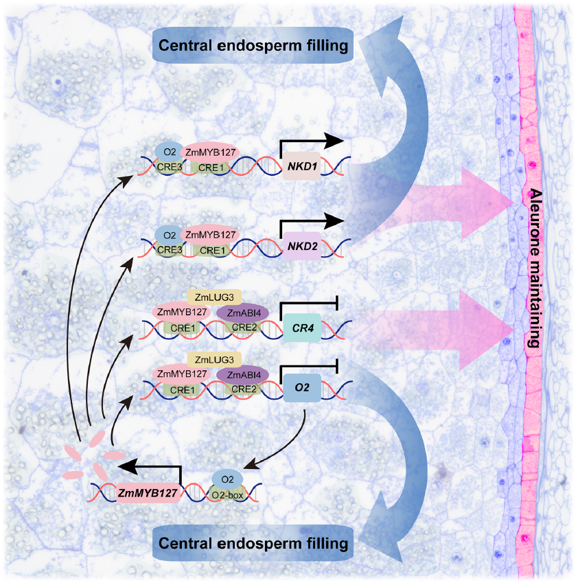 图3 以ZmMYB127为中心调控玉米胚乳填充和糊粉层发育关键基因的转录机制工作模型