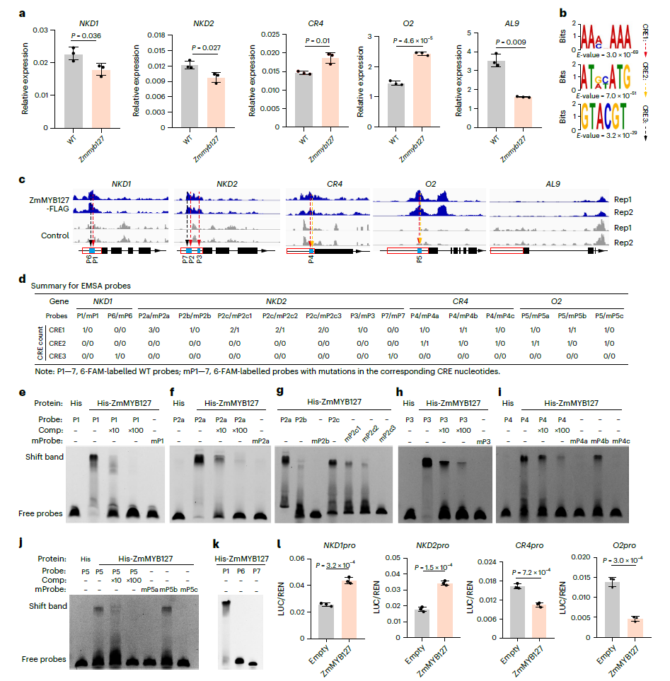 图2 ZmMYB127对NKD1、NKD2、CR4和O2发挥双重转录调控作用