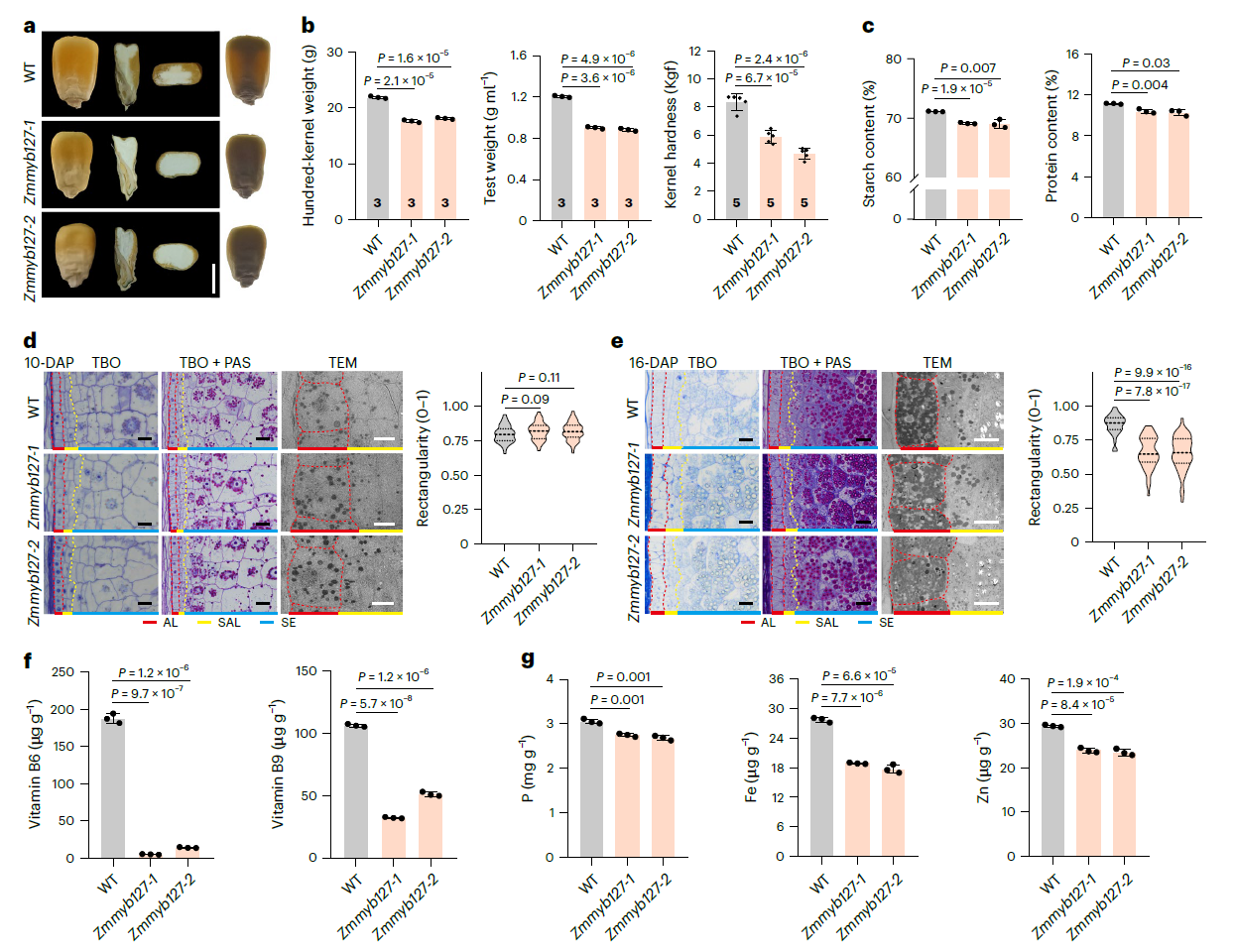 研究团队利用公开的玉米籽粒发育高时间分辨率转录组图谱,鉴定出ZmMYB127是MYB家族转录因子中在灌浆胚乳表达量最高且最特异的转录因子。功能分析表明,ZmMYB127基因敲除会破坏灌浆胚乳中糊粉层的形成,导致籽粒重量、品质和营养价值均显著降低(图1)。