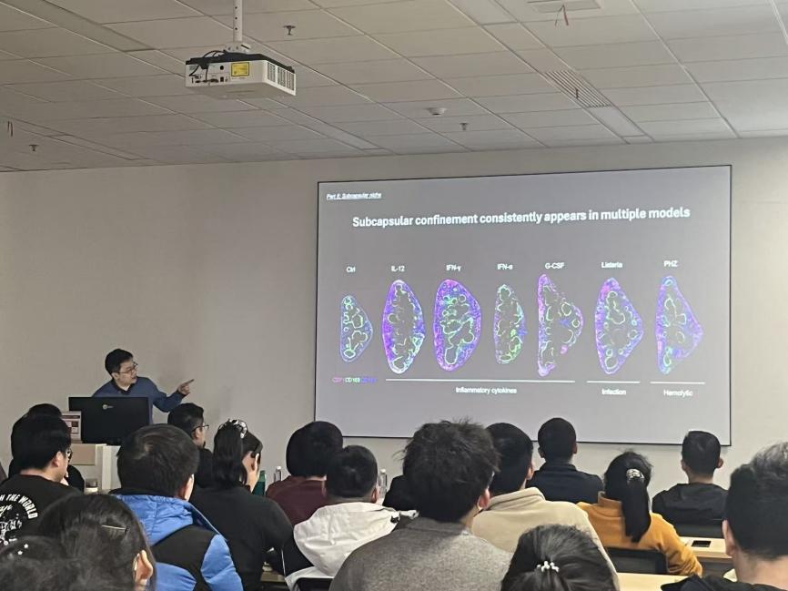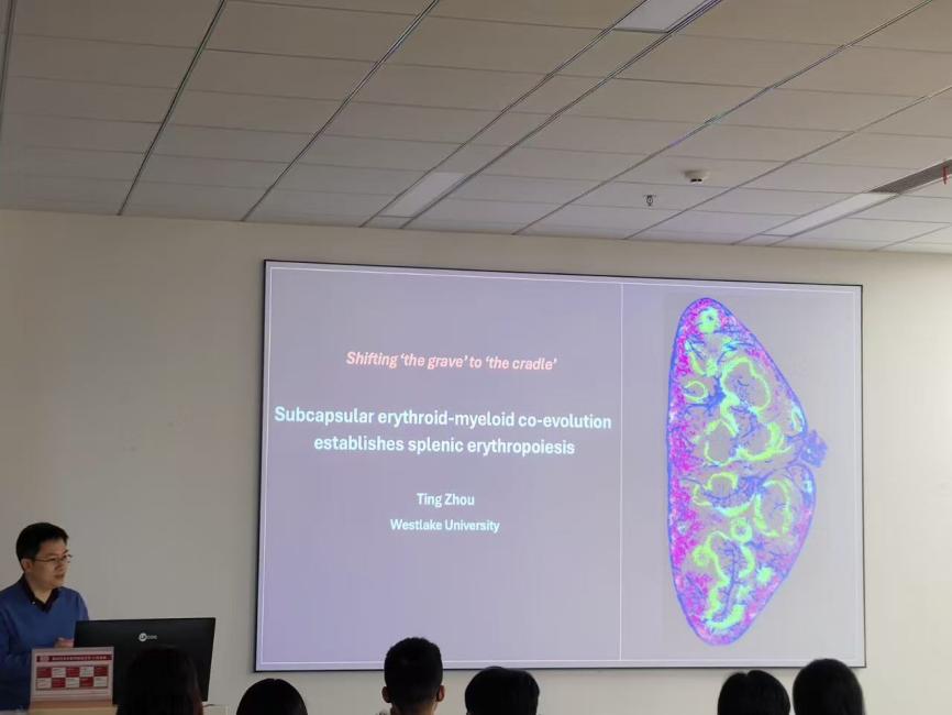 报告开始前,吴清清研究员向在场师生介绍了周挺研究员的科研领域和学术成就等。报告中,周挺老师系统介绍了有关脾脏应激红细胞生成及巨噬细胞功能的最新研究,为贫血、应激造血等相关疾病的诊疗提供了全新理论依据。长期以来,脾脏作为重要的造血器官,其在稳态与应激状态下的红细胞生成调控机制一直是领域内的核心科学问题。周挺老师围绕 “红髓巨噬细胞(RPMs)作为微环境支持细胞” 的核心问题展开深入探讨。研究团队通过动态分析,首次系统刻画了脾脏应激红细胞生成的完整过程,发现了一个特化的包膜下微环境——该区域是应激状态下脾脏红细胞生成的核心场所。该研究明确了RPMs 并非脾脏红细胞生成的微环境支持细胞,而迁移的单核细胞及髓系前体细胞会与红细胞前体细胞在包膜下区域共同演化,形成全新的红细胞岛(EBI)以支撑应激造血。