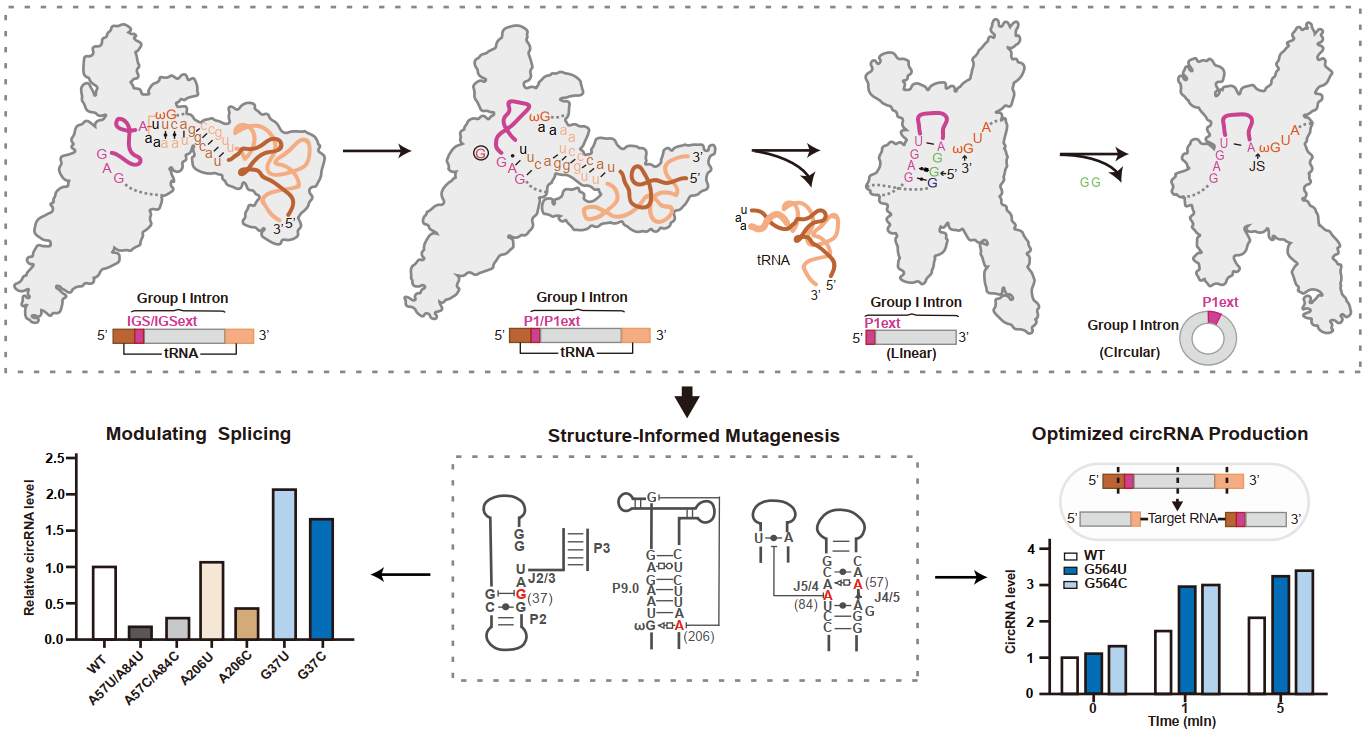 I 类内含子(Group I introns)作为最早发现的催化RNA之一,其自剪接与环化能力不仅是生命起源研究的重要线索,也构成了环状RNA(circRNAs)体外合成的重要基础。然而,包含完整外显子序列的全长核酶结构及其自剪接与环化过程的动态调控机制仍有待进一步阐明。