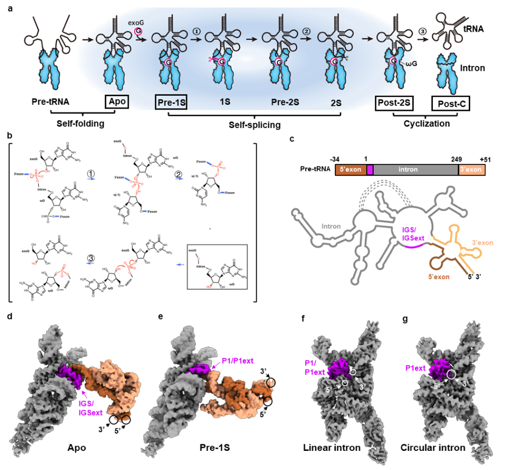 图1:全长Anabaena tRNA(Leu) 前体自剪接与环化的多状态冷冻电镜结构。a. Anabaena tRNA(Leu) 前体催化过程示意图,包括自折叠、自剪接及内含子环化。b. 反应过程中涉及的化学官能团。c. tRNA(Leu) 前体二级结构示意。d-g. tRNA(Leu) 前体的冷冻电镜重构结构。