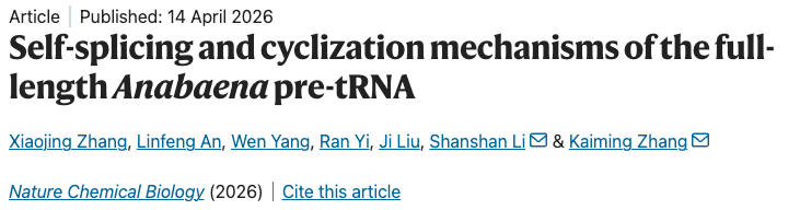 2026年4月14日,中国科学技术大学生医部张凯铭/李珊珊团队在 Nature Chemical Biology期刊上发表题为“Self-splicing and cyclization mechanisms of the full-length Anabaena pre-tRNA”的研究论文, 利用单颗粒冷冻电镜技术捕捉了蓝细菌鱼腥藻(Anabaena sp. PCC 7120)tRNA(Leu) 前体在自剪接与环化过程中的多个关键构象状态,系统揭示了其结构动态机制,并在此基础上实现了环化效率的结构指导优化。同时,该工作受邀配发Research Briefing(“Structural snapshots of self-splicing and circularization of the Anabaena precursor tRNA”),对研究的核心发现进行进一步解读。该研究也是团队在核酶结构与机制研究方向上的又一重要进展(Nature 2021;PNAS 2022;Nucleic Acids Research 2023;Nature Communications 2023;Nature 2025;Nature Catalysis 2025;Nature Communications 2026)。